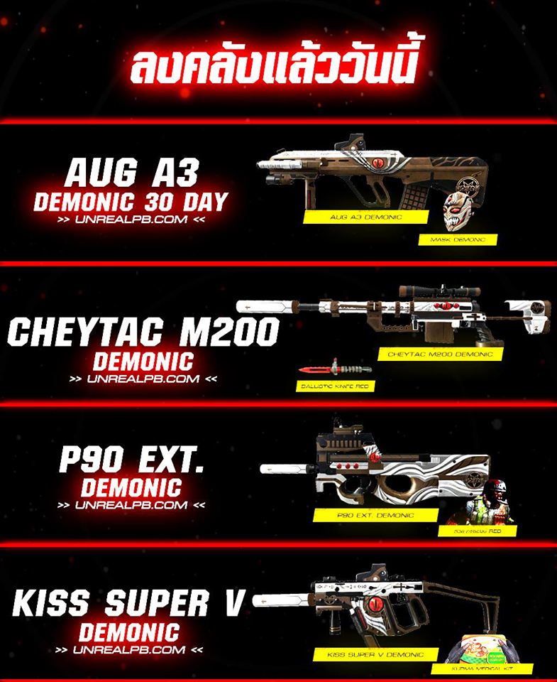 GM.P Posted June 2, 2019 Report Posted June 2, 2019 อัพเดท คลังแสง 3 มิถุนายน 2562 GM อาหมวยแตง จัดให้ EXP+8000% วันเดียวเท่านั้น ❗ พบกับซีรีย์ใหม่ได้แล้ววันนี้ ❗ (GM อาหมวยแตง) กล่องสุ่ม Zombie Slayer รีบเลย วันสุดท้าย ❗ กิจกรรม เม้นชื่อ รับปืนกันไปใช้ฟรี ง่ายๆ คลิก โปรโมชั่นเติมเงิน แถมเหรียญฉายา อัพเดท 1 มิถุนายน คลิก สมัคร Cafe ร้านเกมส์ อัพเดท 20 พฤษภาคม คลิก โปรโมชั่นสมัครไอดีใหม่ อัพเดท 1 มิถุนายน คลิก ล็อคอินรับไอเท็มฟรี อัพเดท 2 มิถุนายน คลิก สำหรับสายฟรี รับปืนและไอเท็มฟรี อัพเดททุกวัน คลิก เล่นครบ 200 นาที รับไอเท็มฟรี อัพเดท 2 มิถุนายน คลิก กฎห้ามเซิฟ UNREALPB ควรอ่านถ้าไม่อยากโดนแบน คลิก จำหน่ายซีรีย์ PBIWC2019 (ปืนใหม่ล่าสุด มีเอฟเฟค) PBWC2019 (ปืนใหม่ล่าสุด) PANDORA (เพิ่มมาวันที่ 3 มิถุนายน) Dolphin (เพิ่มมาวันที่ 3 มิถุนายน) MAZE (เพิ่มมาวันที่ 3 มิถุนายน) Latin7 PBTC2016 CoupleBreaker Miku จำหน่ายเช็ต Demonic Set Skeleton Package (เพิ่มมาวันที่ 3 มิถุนายน) ZOMBIE SLAYER MAZE Set (เพิ่มมาวันที่ 3 มิถุนายน) E-SPORT SET (เพิ่มมาวันที่ 3 มิถุนายน) MSI SET Kriss Sv. UPB SET AUG A3 ASIIMOV Set Midnight Package Kriss S.V Red Dawn Package SHATTER Z1 SET SHATTER UM SET Miku 2018 Set Uncharted/Black Panther/Blue E-sport/Pro Player คำสั่งปิด/เปิด อาวุธ หัวห้องพิมพ์คำสั่งก่อนเริ่มเกมส์เท่านั้นค่ะ ! /mask on = เปิดให้ใช้หน้ากาก /mask off = ปิดไม่ให้ใช้หน้ากาก เข้าเกมส์แล้วจะไม่มีหน้ากาก /sg on = เปิดให้ใช้ลูกซอง /sg off = ปิดไม่ให้ใช้ลูกซอง /brt on = เปิดใช้ barrett m82a1 /brt off = ปิดไม่ให้ใช้ barrett m82a1 ทุกซีรีย์ /knife on = เปิดให้ใช้มีด /knife off = ปิดให้ใช้มีด ใช้ได้แค่มีด M7เดิมๆ กลุ่มพูดคุย แอดมินดูแลอยู่ตลอดเวลา ❗ คลิก กลุ่มซื้อขายไอดี กลางผ่านแอดมินเท่านั้น ❗ คลิก