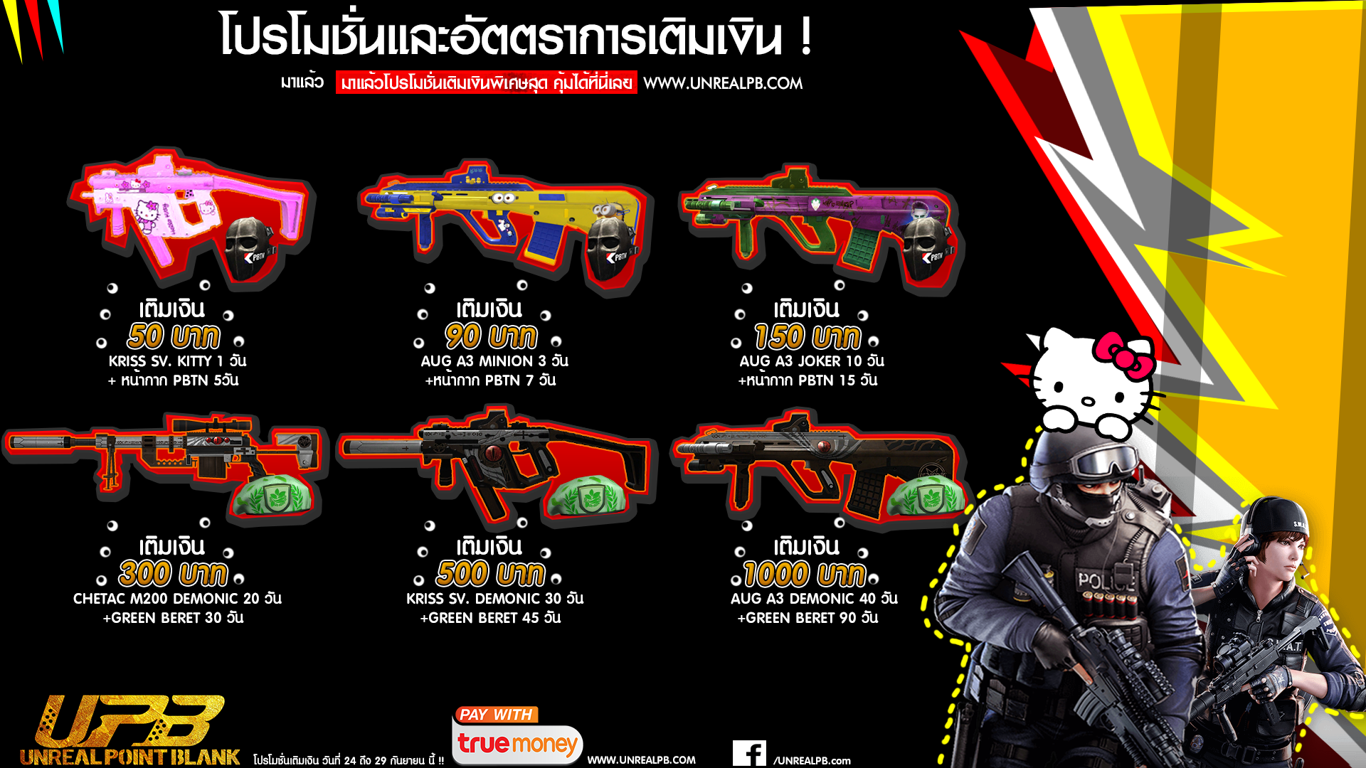 GM.P Posted September 24, 2019 Report Posted September 24, 2019 อัพเดท คลังแสง 24 กันยายน ยินดีต้อนรับสมาชิกใหม่ทุกท่านนะคะ ทีมงานดูแลตลอด 24 ชม พบเจอปัญหาเข้าเกมส์ไม่ได้ ติดต่อแฟนเพจได้เลย นะคะ โปรโมชั่นเติมเงิน แถมเหรียญฉายา อัพเดท 24 กันยายน คลิก สมัคร CAFE ร้านเกมส์ อัพเดท 24 มิถุนายน คลิก โปรโมชั่นสมัครไอดีใหม่ อัพเดท 24 มิถุนายน คลิก ล็อคอินรับไอเท็มฟรี อัพเดท 24 กันยายน คลิก เล่นครบ 200 นาที รับไอเท็มฟรี อัพเดท 24 กันยายน คลิก กฎห้ามเซิฟ UNREALPB ควรอ่านถ้าไม่อยากโดนแบน คลิก จำหน่ายซีรีย์ DEFINITE Beach HOLI PALADIN จำหน่ายเซ็ต MIDNIGHT PACKAGE RAZER PACKAGE GSL 2013 SUPER PACKAGE GRS SET Zombie Slayer Graduation SET E-Sport/Black Panther/Uncharted/Pro Player คำสั่งปิด/เปิด อาวุธ (หัวห้องเท่านั้น) /mask on = เปิดให้ใช้หน้ากาก /mask off = ปิดไม่ให้ใช้หน้ากาก เข้าเกมส์แล้วจะไม่มีหน้ากาก /sg on = เปิดให้ใช้ลูกซอง /sg off = ปิดไม่ให้ใช้ลูกซอง /brt on = เปิดใช้ barrett m82a1 /brt off = ปิดไม่ให้ใช้ barrett m82a1 ทุกซีรีย์ /knife on = เปิดให้ใช้มีด /knife off = ปิดให้ใช้มีด ใช้ได้แค่มีด M7เดิมๆ กลุ่มพูดคุย แอดมินดูแลอยู่ตลอดเวลา คลิก กลุ่มซื้อขายไอดี กลางผ่านแอดมินเท่านั้น คลิก กลุ่มการแข่งขัน เซิฟ UNREALPB คลิก
